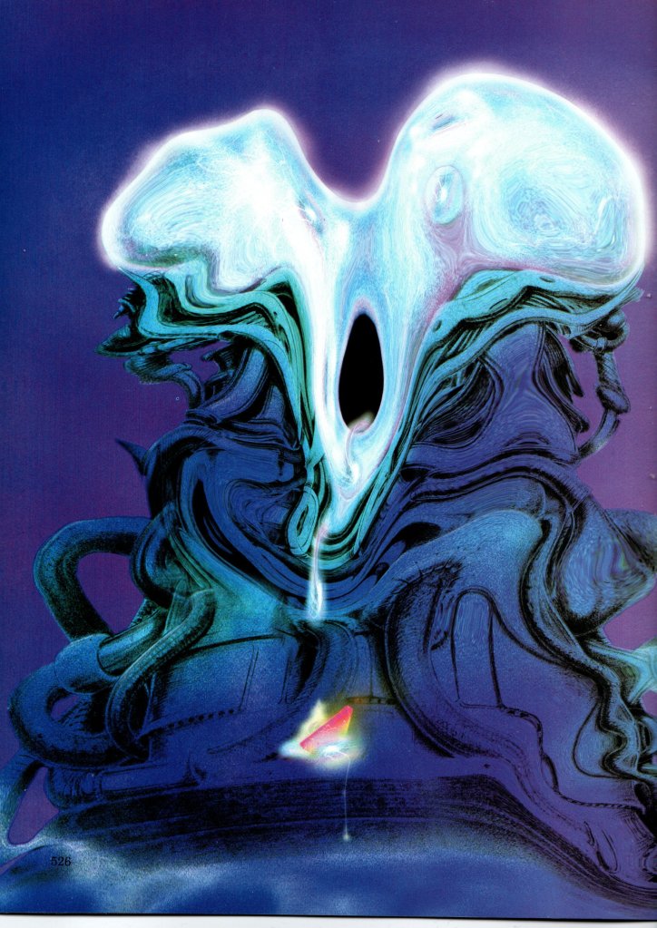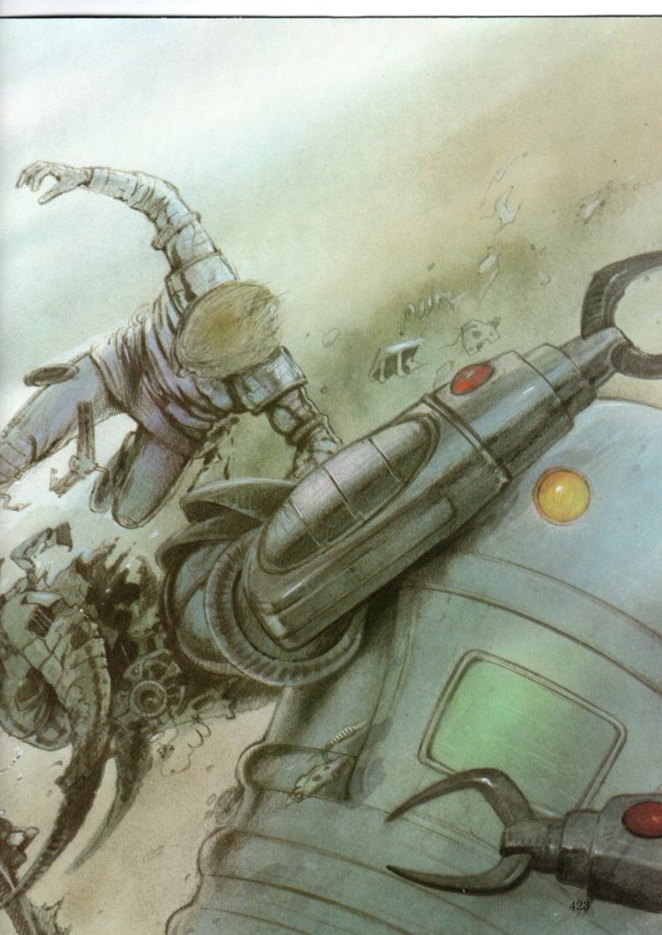 Come per la prima metà de La Storia Ancestrale, anche qui la parte del leone la fanno i disegni di Julek Heller, coadiuvati per l’occasione dalle creazioni al computer di Mehau Kulyk, accesi da colori spinti ai limiti della fluorescenza e deformati da lavori di postproduzione. Se infatti per leggere un volume bastano i canonici dieci/quindici minuti, capita più volte di soffermarsi anche per svariato tempo a contemplare le immagini che immortalano paesaggi in splash page (un unico disegno che ricopre senza soluzione di continuità entrambe le facciate del volume). In alcune occasioni si tratta di soluzioni grafiche ormai sorpassate, vista l’evoluzione dei mezzi, ma per l’epoca offrivano un impatto visivo notevole e ancora oggi, al di là dell’indubbia bellezza, conservano quel fascino del “futuro visto con gli occhi del passato”.