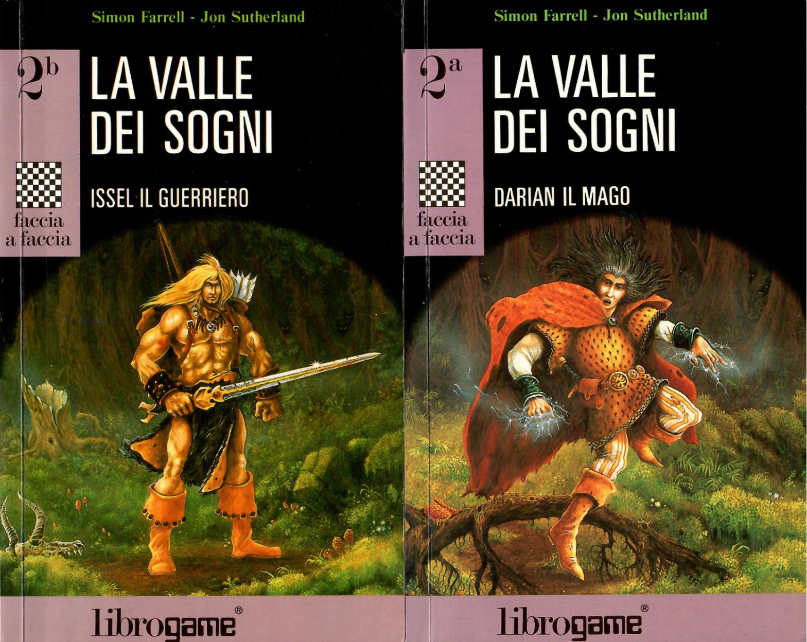 Scritta da Simon Farrell e Jon Sutherland (coautori di un’altra avventura “in doppio” mai pubblicata in Italia), La valle dei sogni, come già si nota dalla duplice copertina, è un libro game composto da due volumi distinti, uno per ognuno dei personaggi: Darian il mago e Issel il guerriero. Due i volumi, unica l’avventura; anche se esistono sostanziali differenze.