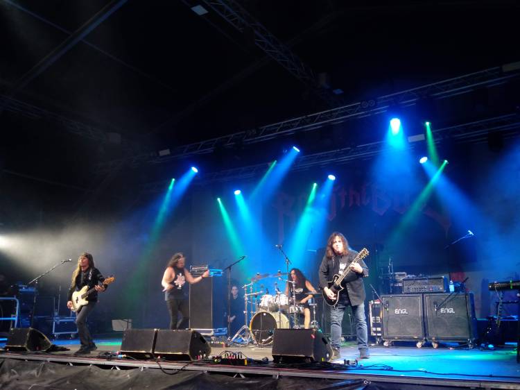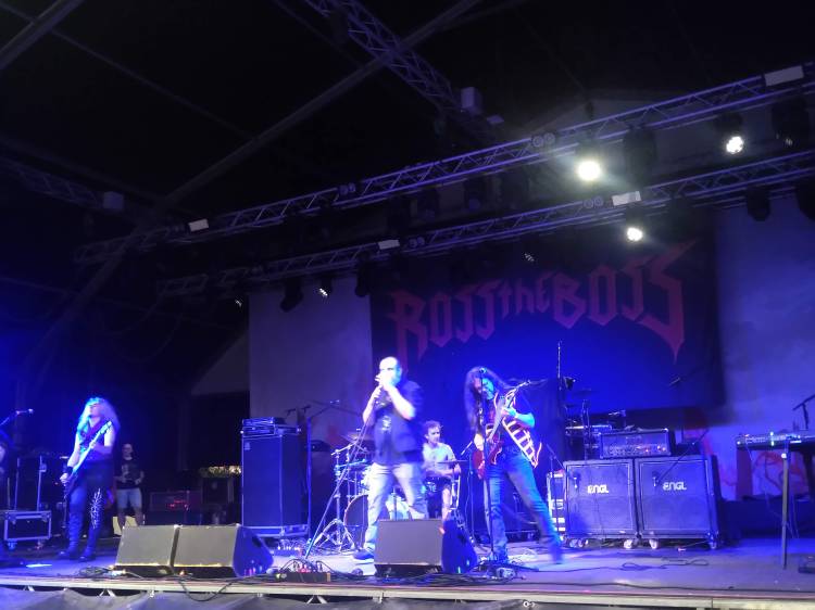 Cambio palco rapidissimo (sarà così per tutto il festival) e già appare la figura appesantita del mitico Ross the Boss, ex chitarrista dei Manowar dei tempi d’oro. Dall’altro lato del palco adocchio a sorpresa un altro volto noto: il bravissimo Dirk Schlächter, già bassista dei Gamma Ray.